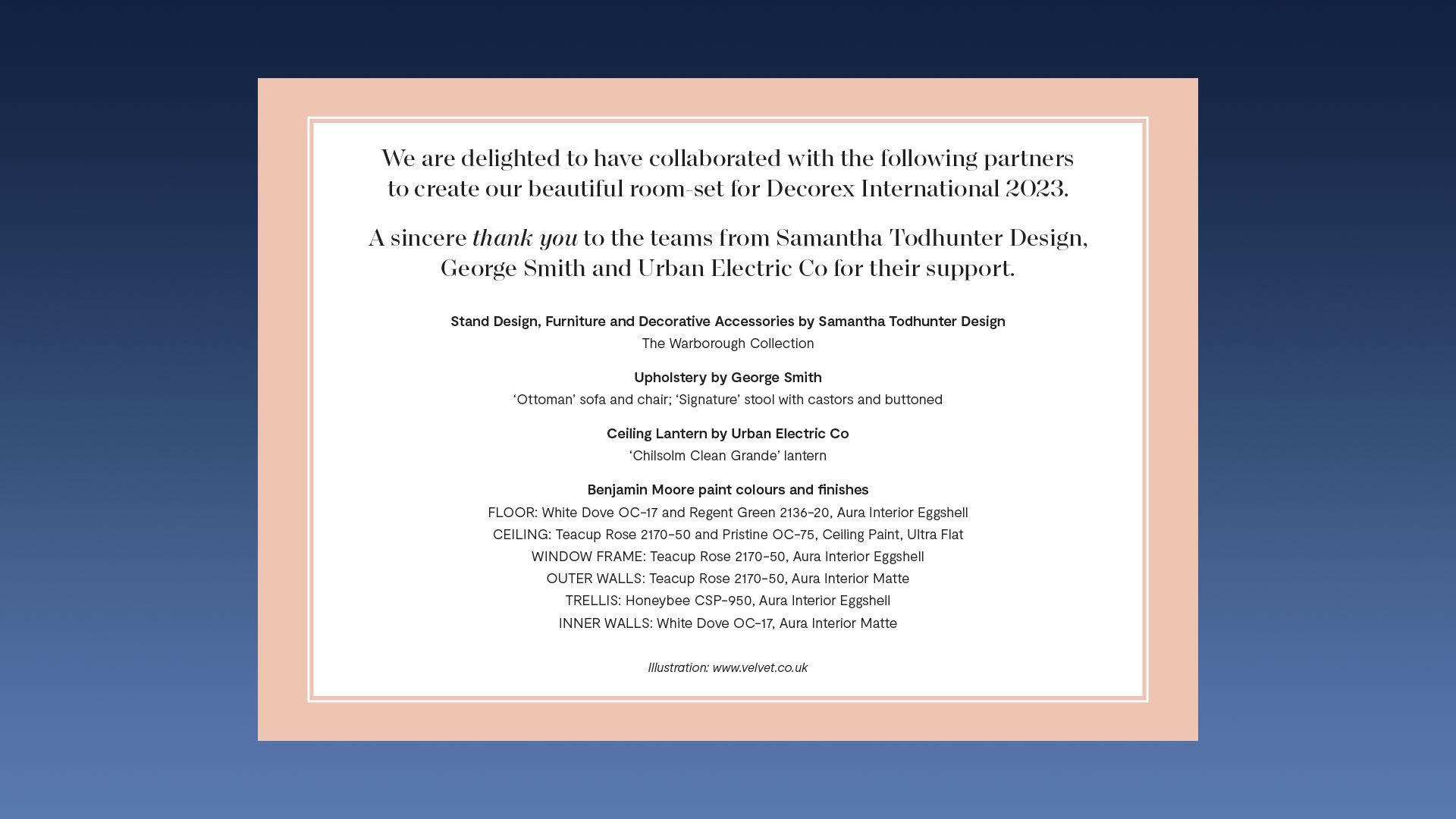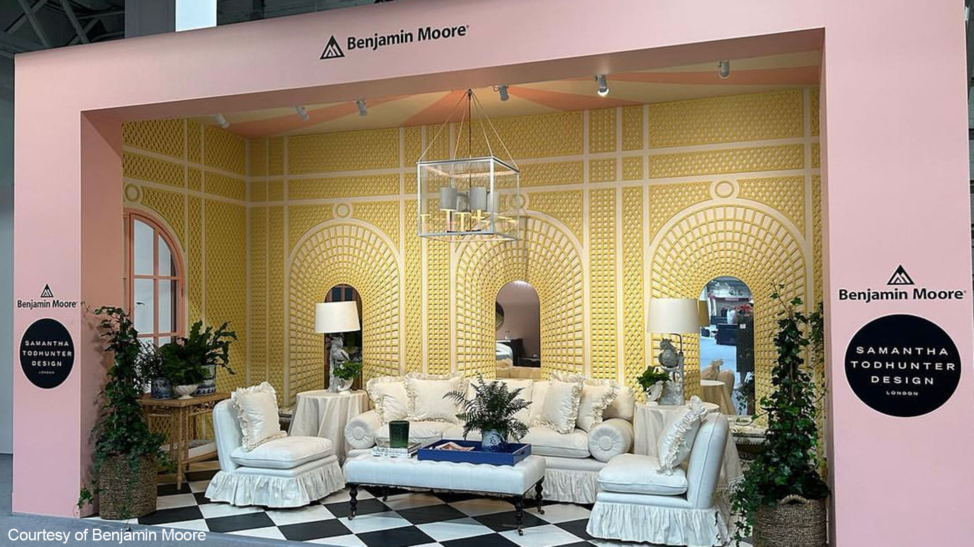 Benjamin Moore & Co is one of North America’s leading manufacturers of premium quality residential, commercial and industrial maintenance coatings. The 2023 Decorex stand, designed by Samantha Todhunter Design, was inspired by the classic English country house garden room, a combination of elegance and tradition.