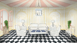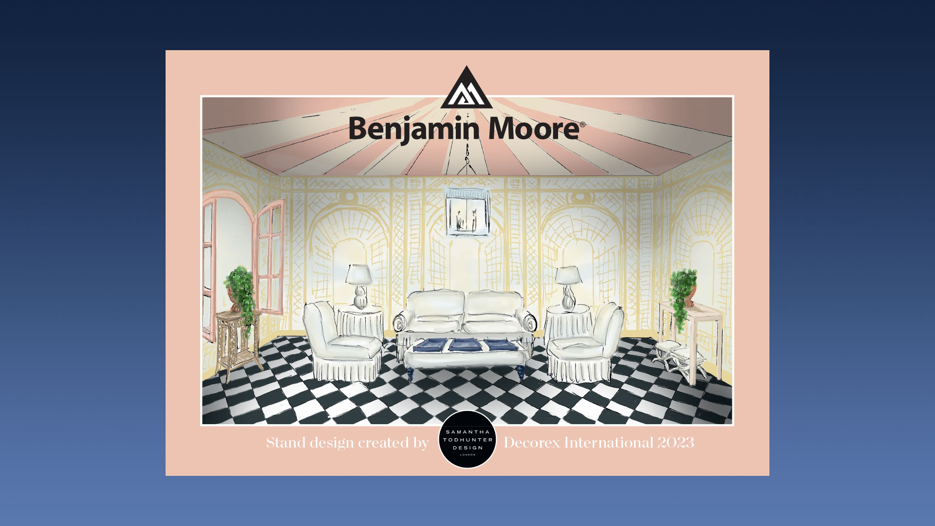 Benjamin Moore commissioned an artist’s impression based on CAD drawings of their 2023 Decorex International stand, for a flyer at the event.
